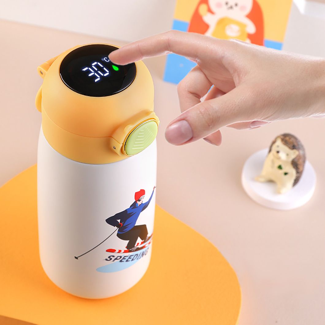 This kids' thermos cup gets rid of the trouble of testing the water temperature. With just a gentle touch, it can display the temperature. The lid is yellow, and there's a digital display on top that shows the temperature clearly. It's very convenient for kids to know if the water is suitable to drink, ensuring they can enjoy their drink safely and comfortably.