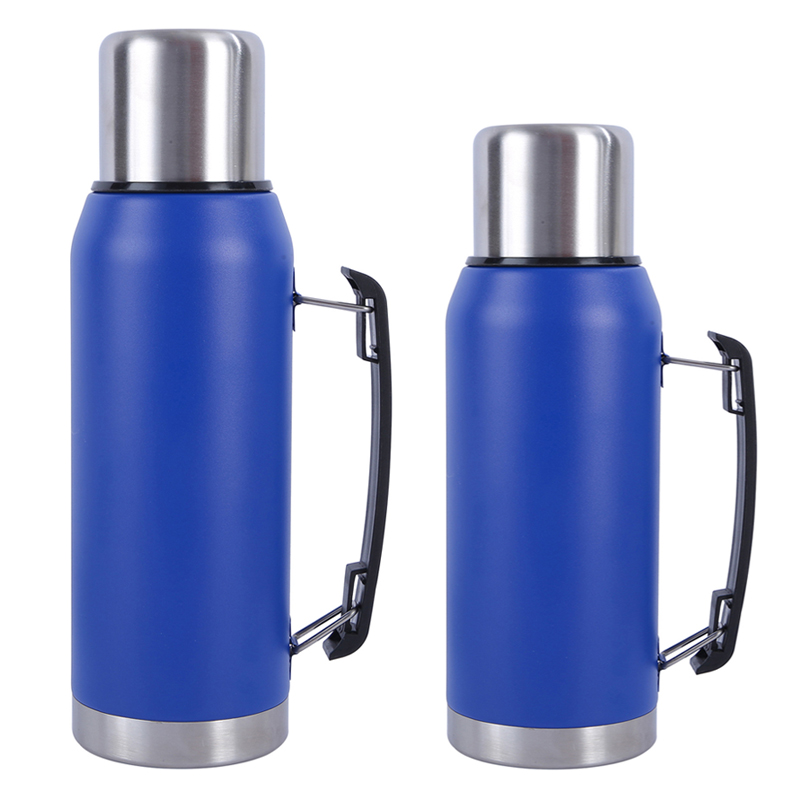 This image shows a blue vacuum flask with a black handle. The handle is ergonomically designed, making it comfortable to grip. It's firmly attached to the flask body with metal fasteners, ensuring durability and stability during carrying.