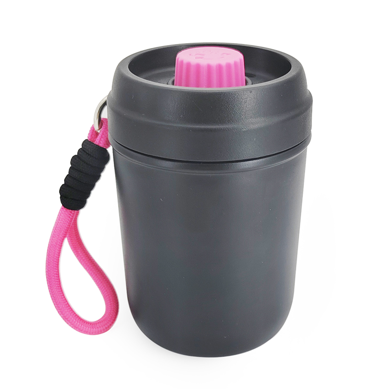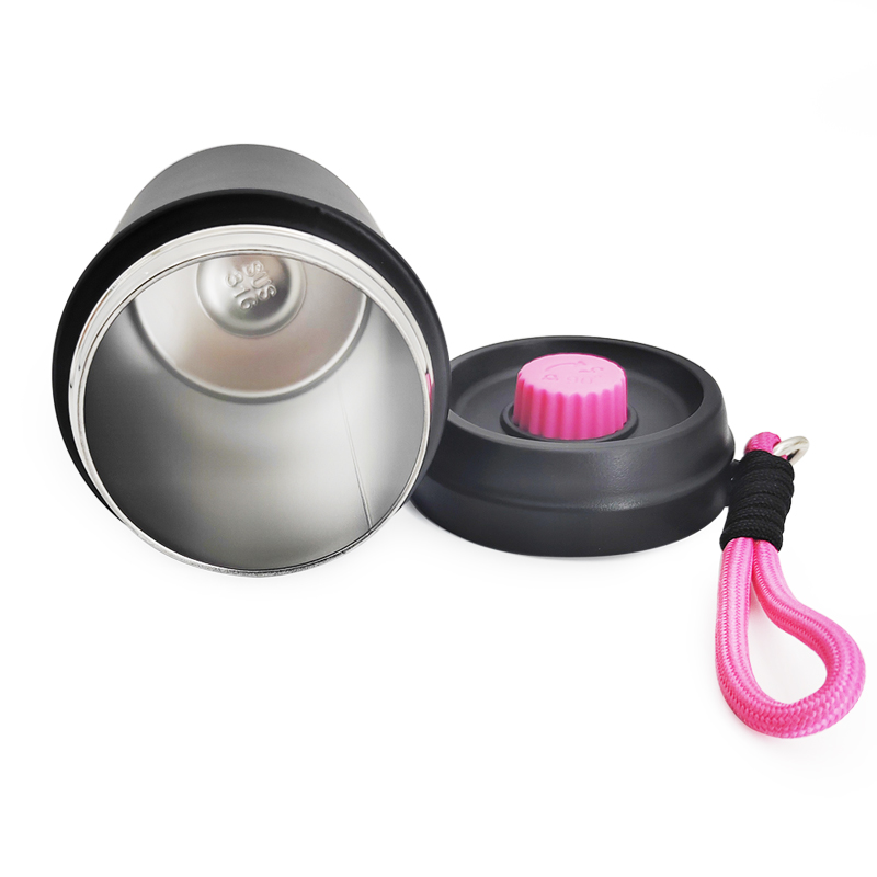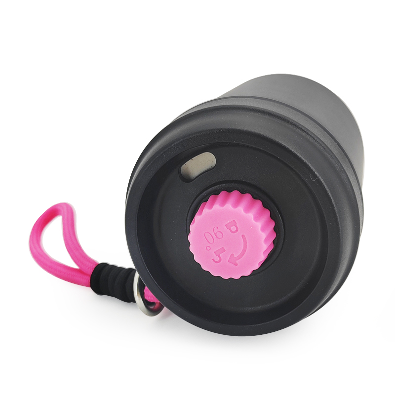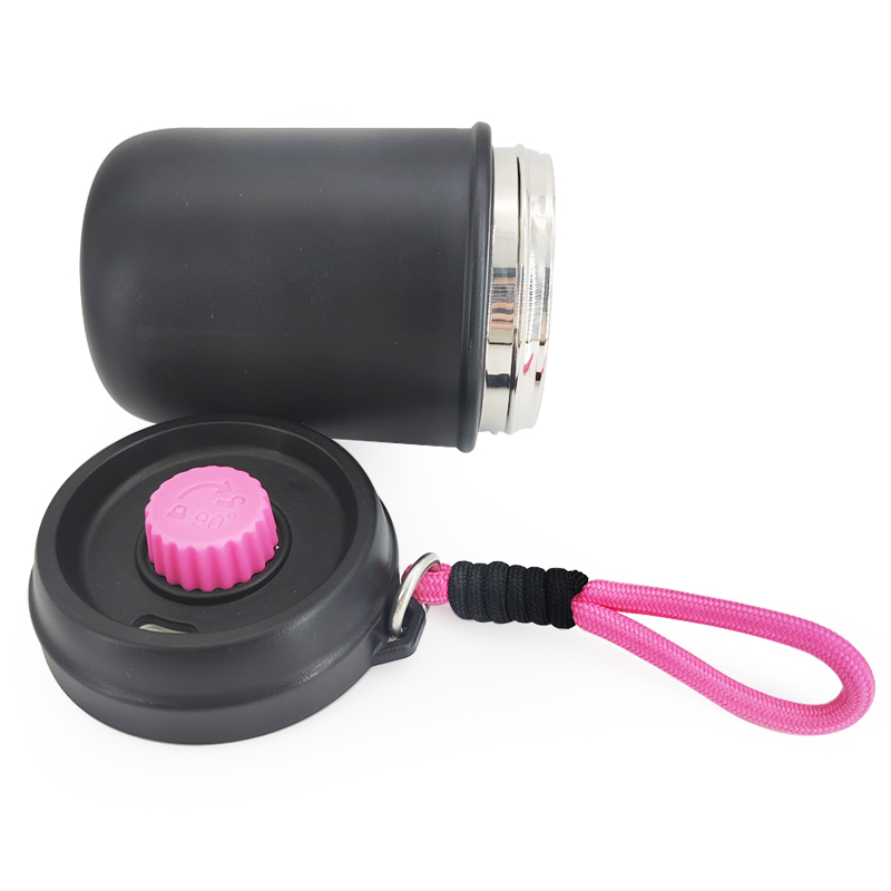 The design features a minimalist yet practical appearance, combining a dark gray base with a pink handle and knob lid for both aesthetic appeal and portability. Crafted from 304 stainless steel, it offers secure durability with excellent thermal insulation properties. The sealed lid effectively prevents spills, making it ideal for carrying coffee during daily commutes or storing beverages and snacks outdoors – delivering both functionality and convenience.