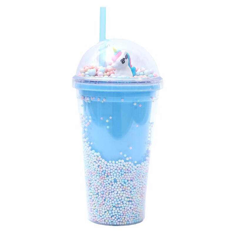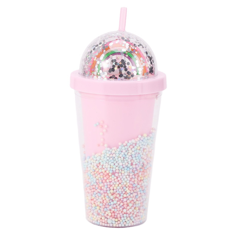 The domed lid steals the show: choose between a shimmering rainbow (swirled with star glitter) or a tiny 3D unicorn (nestled in pastel beads)—it’s like carrying a mini fairy tale everywhere you go. The cup’s double wall is filled with floating pastel beads and glitter, so it shimmers with every movement (no mess, just magic!).