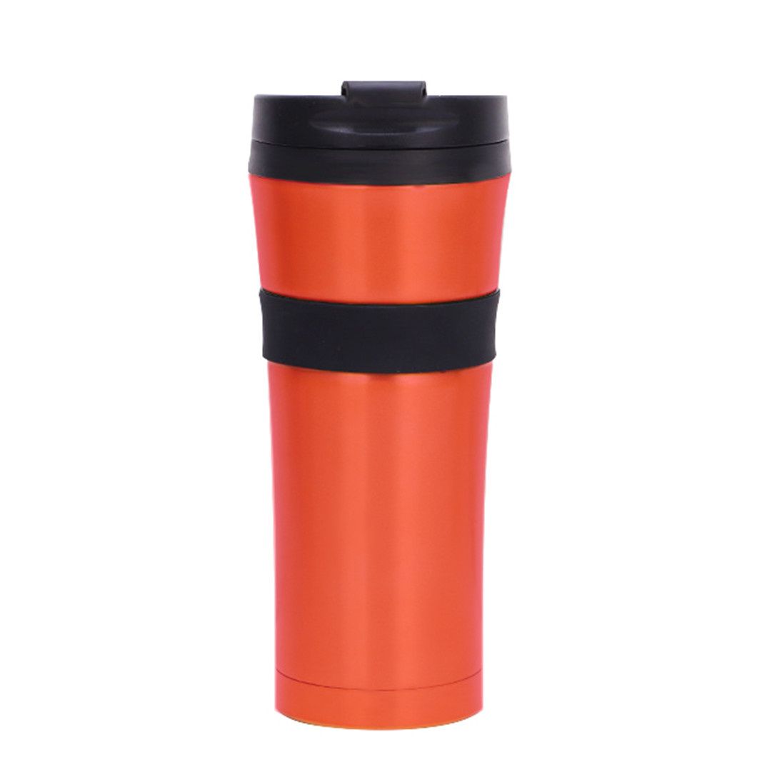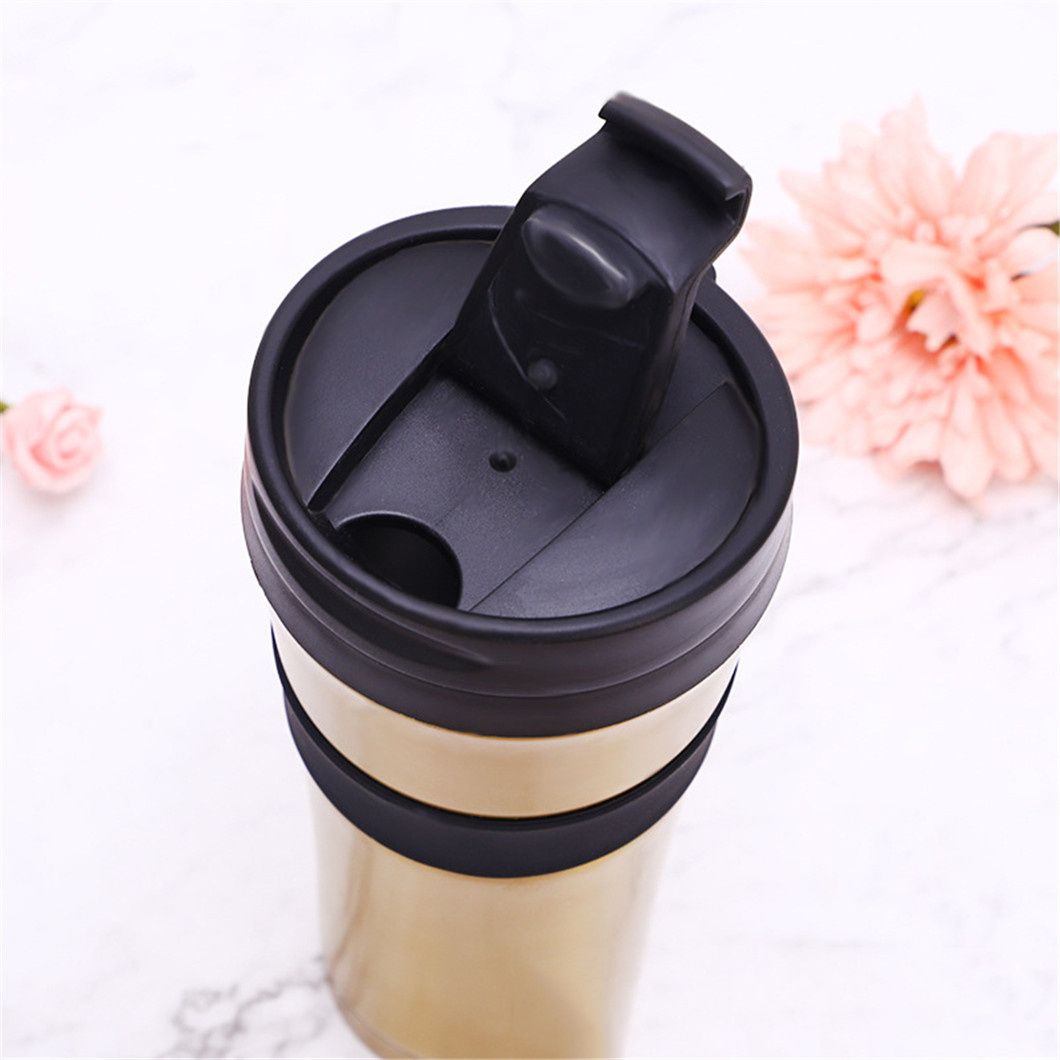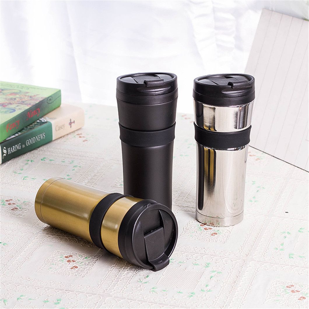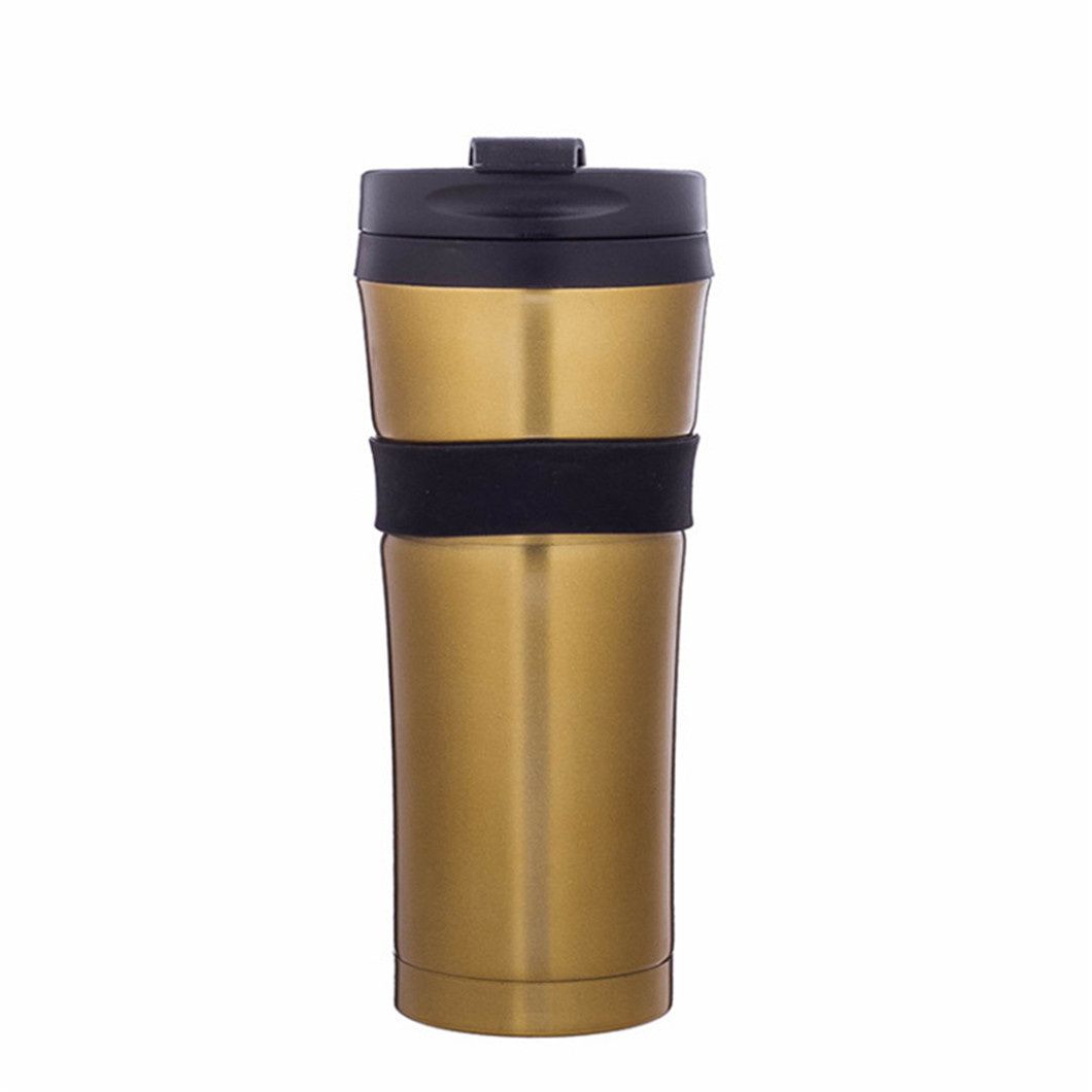 This stainless steel thermos comes in gold, black, and silver finishes, with customization options available. Featuring a sleek black lid and a durable black rubber ring at the center that prevents slipping and protects the cup, it's perfect for carrying your daily beverages like coffee or hot water.