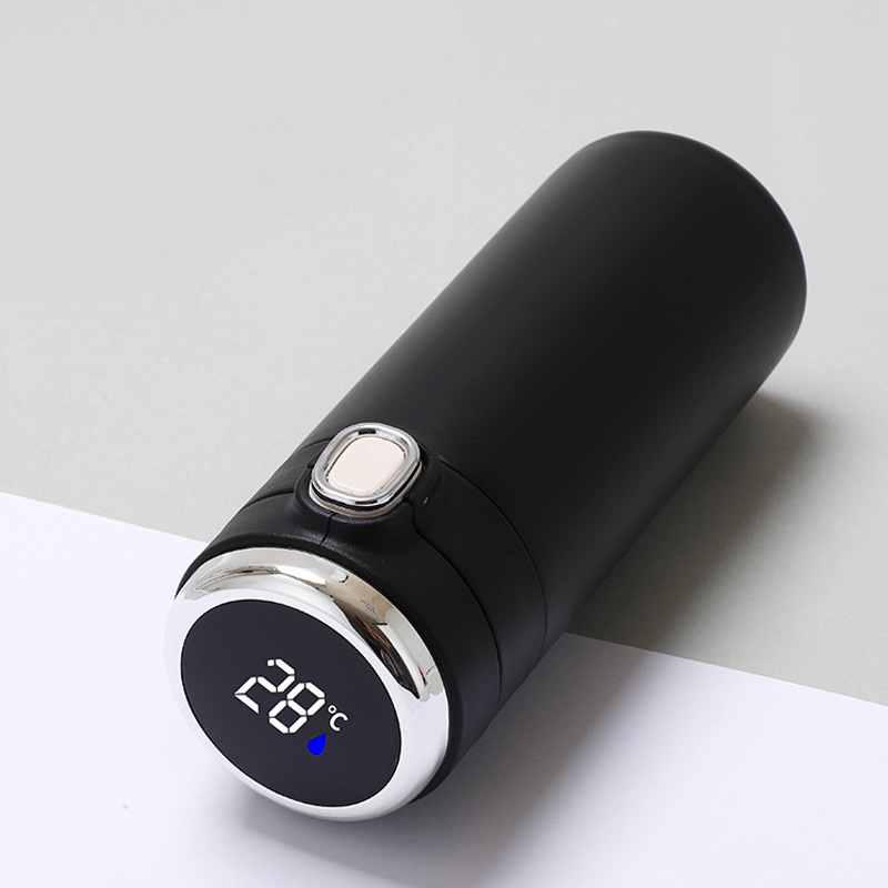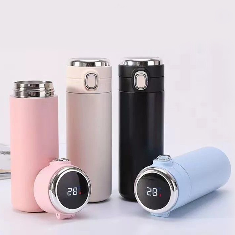 These thermos flasks come in a variety of charming colors, including light blue, pink, beige, and black. One of their outstanding features is the built - in temperature display. As shown in the picture, you can easily check the temperature of the liquid inside, with readings like 56°C and 28°C clearly visible.