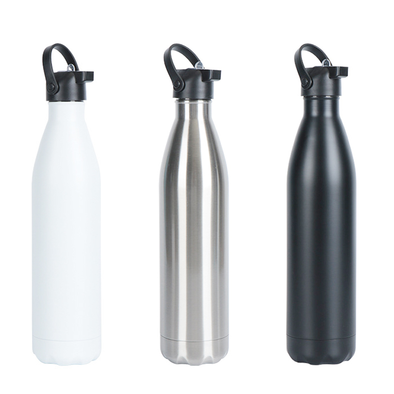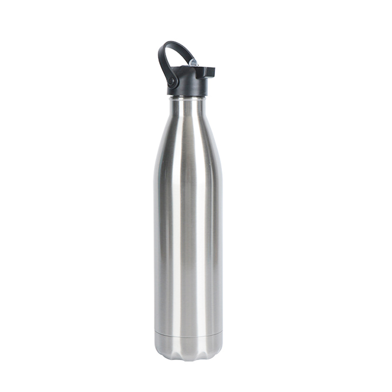 This is a 750ml stainless steel water bottle. It has a sleek, metallic appearance and a black handle on the cap for easy carrying, suitable for various occasions like outdoor activities or daily use.